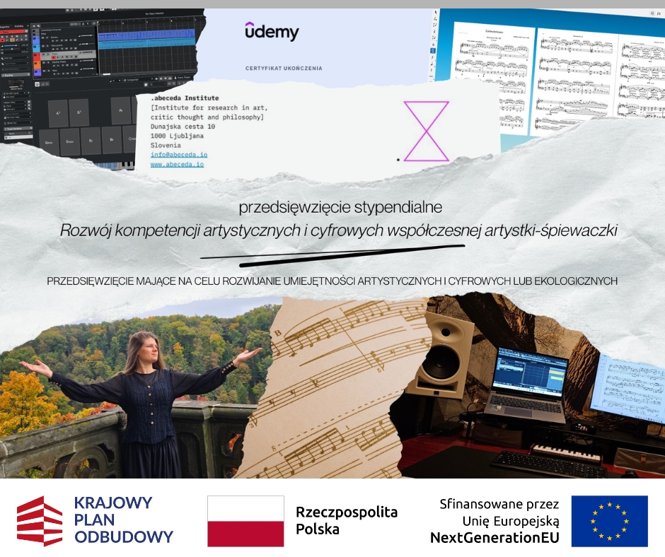 As part of the project, I improved my vocal skills by participating in a masterclass in early music, in a singing and chamber music class at the Kielcensis Academy, and in a series of meetings as part of a programme for contemporary music performers organised by the .abeceda Institute and the Ministry of Culture of the Republic of Slovenia. I also expanded my digital skills by completing a series of courses on working with DAW programmes, with a particular focus on Cubase, music production and sound engineering, and advanced work in Dorico. In addition, as part of the scholarship, I developed my studio by acquiring new software and equipment that allow me to work independently and more ecologically on audio projects.